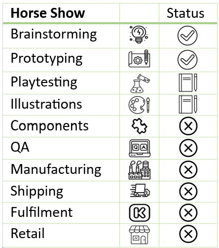 February 2025: Playtesting is in full swing, with exciting refinements including improved balance for riders and horses, revised turn order mechanics, enhanced event rewards, a redesigned turn mat, an arena mat with pole positions, adjusted starting coins, rebalanced event cards, a new end-of-event rule, an updated rulebook, and the beginning of the search for an artist, all leading up to blind playtesting—thank you for your invaluable feedback!